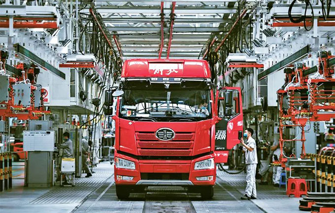 企業(yè)強(qiáng)則國家強(qiáng),加快建設(shè)世界一流企業(yè)是全面建設(shè)社會(huì)主義現(xiàn)代化國家的重大任務(wù),是新時(shí)代國有企業(yè)的戰(zhàn)略目標(biāo)。近來,一汽解放集團(tuán)股份有限公司生產(chǎn)按下“加速鍵”。圖為2022年6月15日,工人在位于吉林長春的一汽解放總裝車間內(nèi)裝配車輛。 新華社記者 許暢/攝
